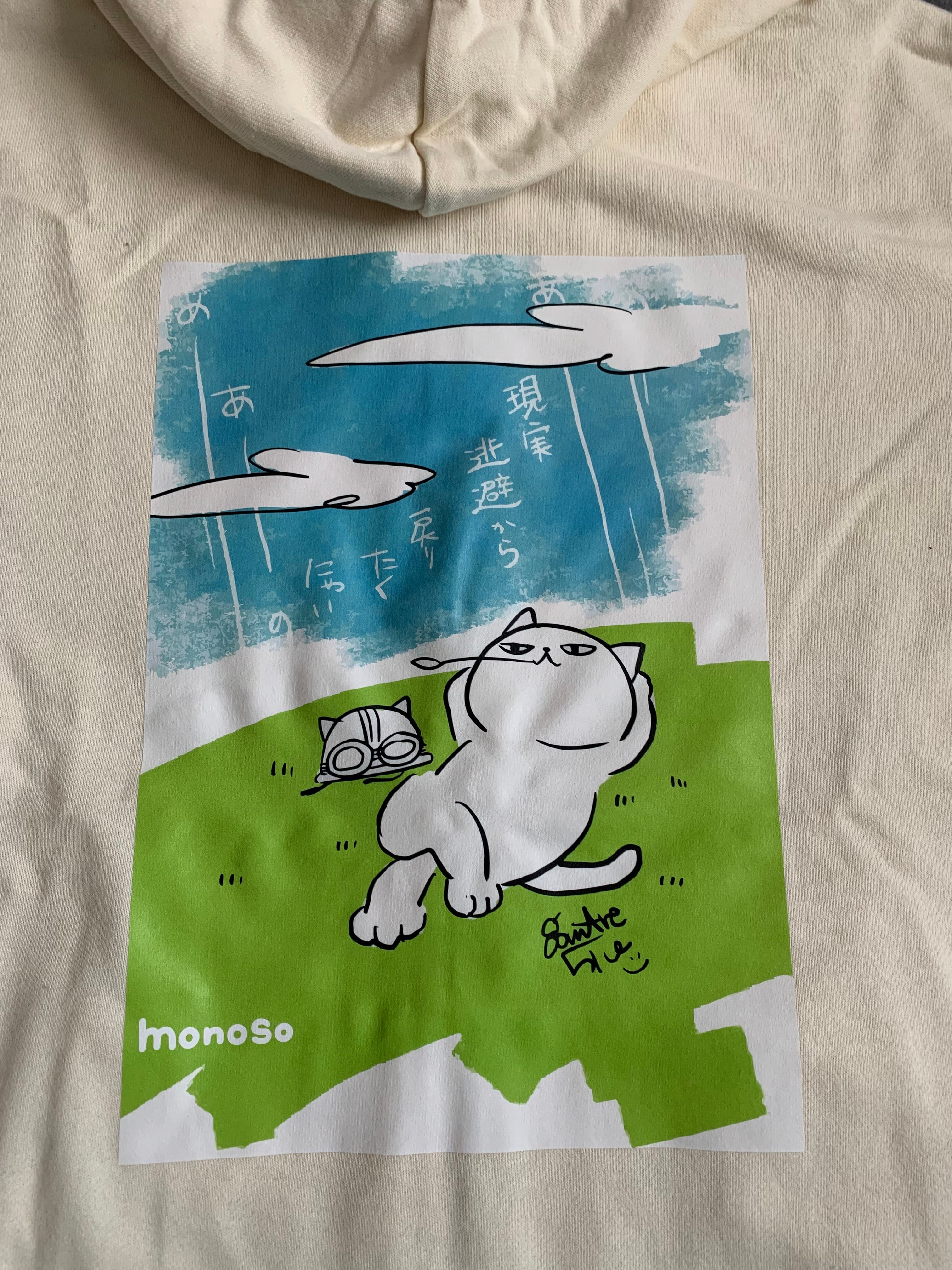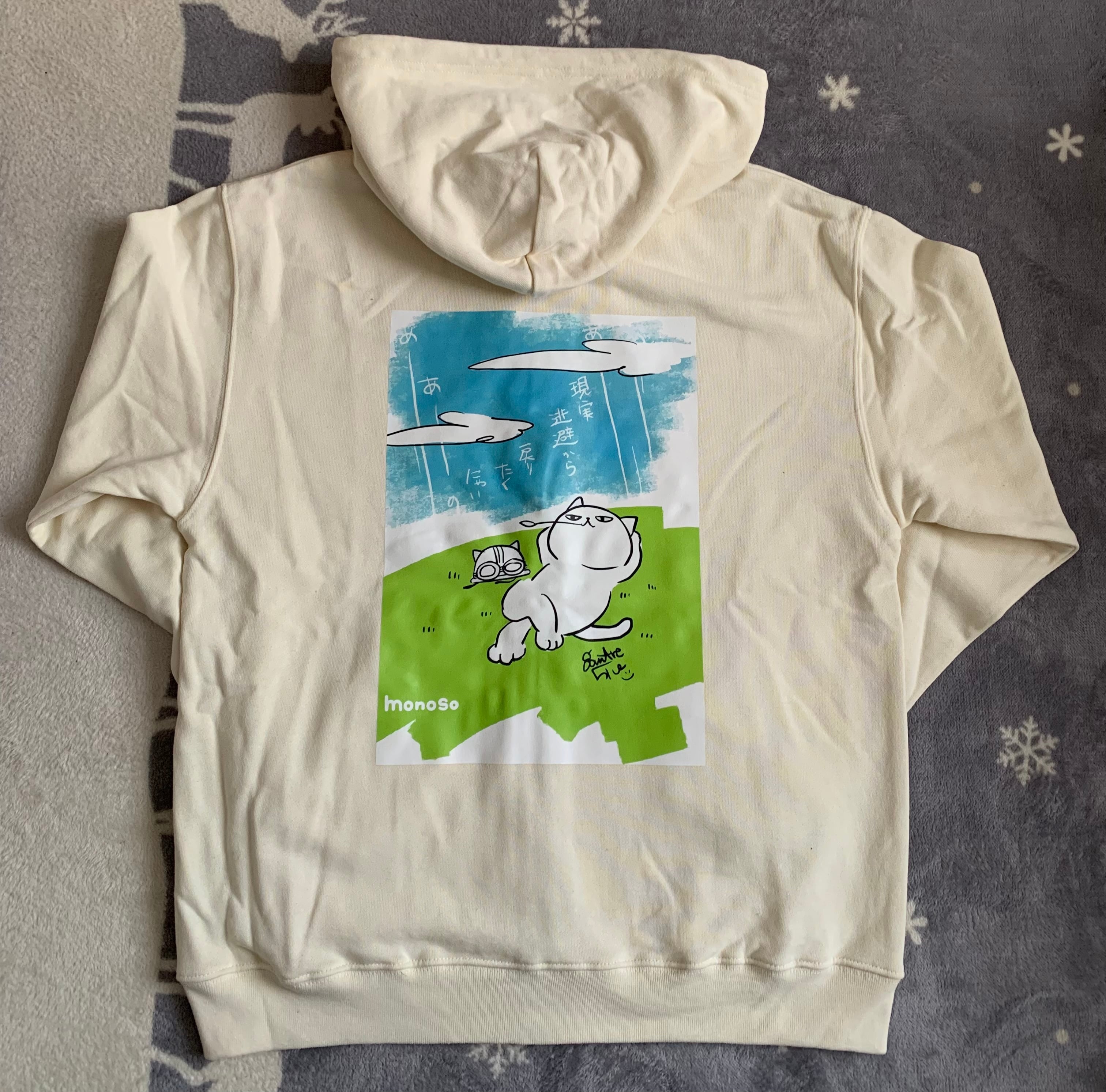 背中には謎ネコがまったりと現実逃避しているイラストがプリントされたパーカーです♪